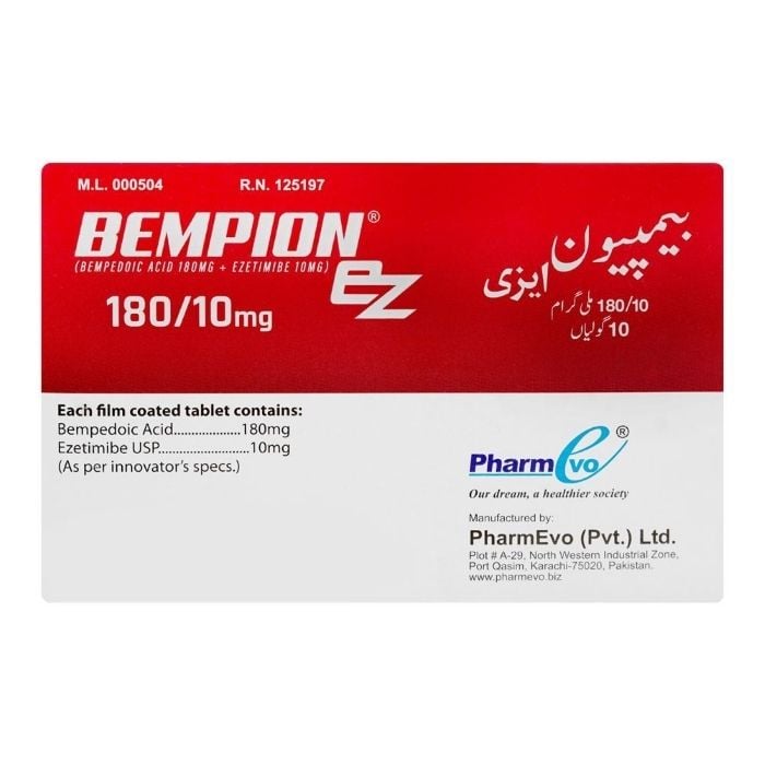 Bempion ez tab 180/10mg 10s is a medication that combines Ezetimibe and Bempedoic Acid to lower cholesterol levels in the body. It is used to treat high cholesterol, specifically low-density lipoprotein (LDL) cholesterol, also known as "bad" cholesterol.