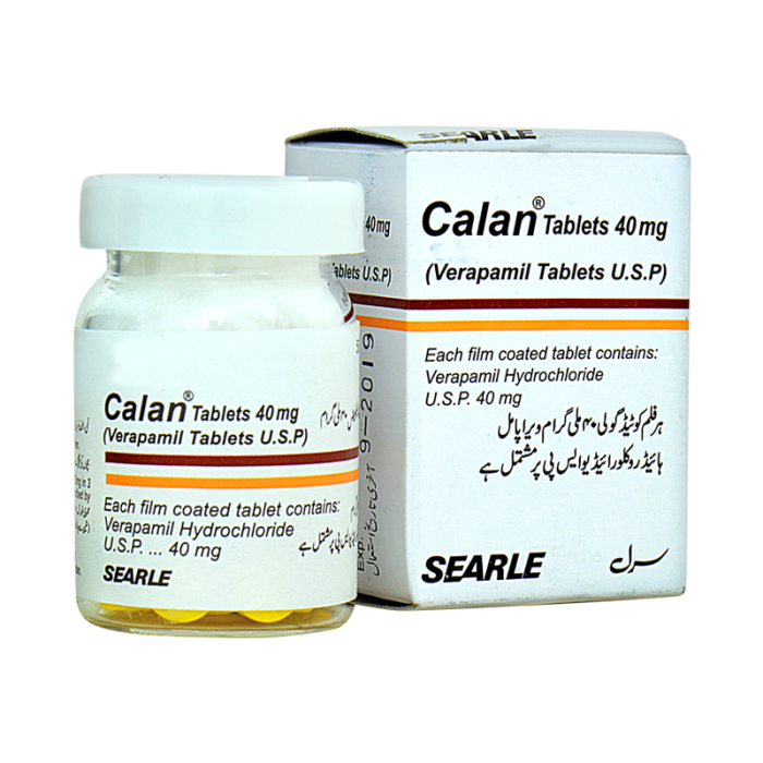 Calan 40mg Tablets are a medication used to treat high blood pressure (hypertension) and chest pain (angina). These tablets belong to a class of drugs known as calcium channel blockers, which work by relaxing blood vessels and increasing the supply of blood and oxygen to the heart.