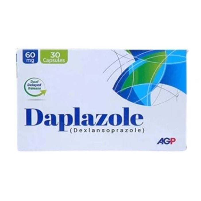 Daplazole 60mg Capsules by AGP are a medication used to treat acid-related stomach and throat problems such as acid reflux, heartburn, and ulcers. The active ingredient, Dexlansoprazole, works by decreasing the amount of acid produced in the stomach.