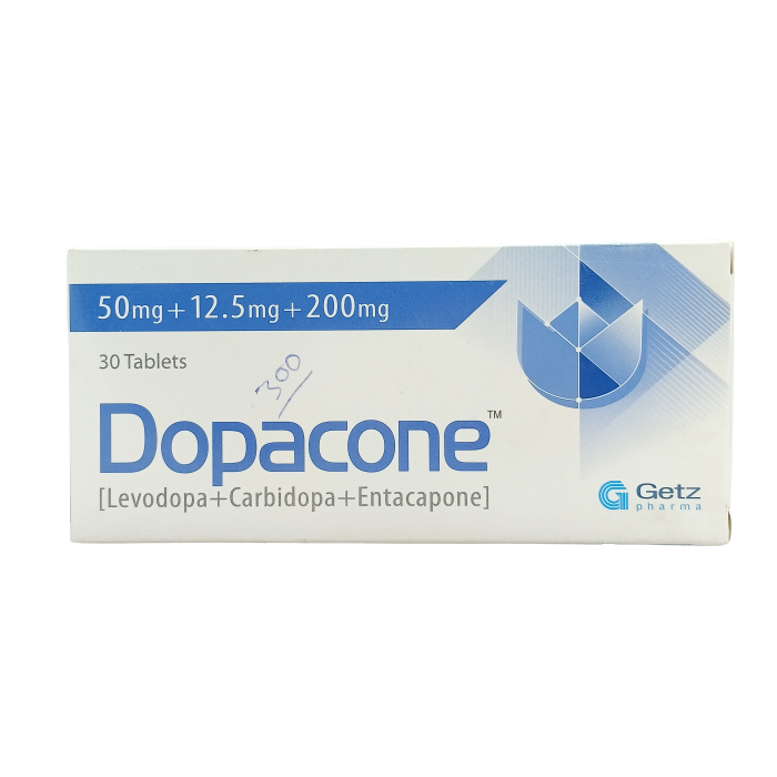 Dopacone 50mg 12.5mg 200mg Tablets are a medication used to treat symptoms of Parkinson's disease. These tablets contain a combination of Carbidopa, Entacapone, and Levodopa, which work together to improve movement and reduce tremors, stiffness, and slowness associated with the condition.
