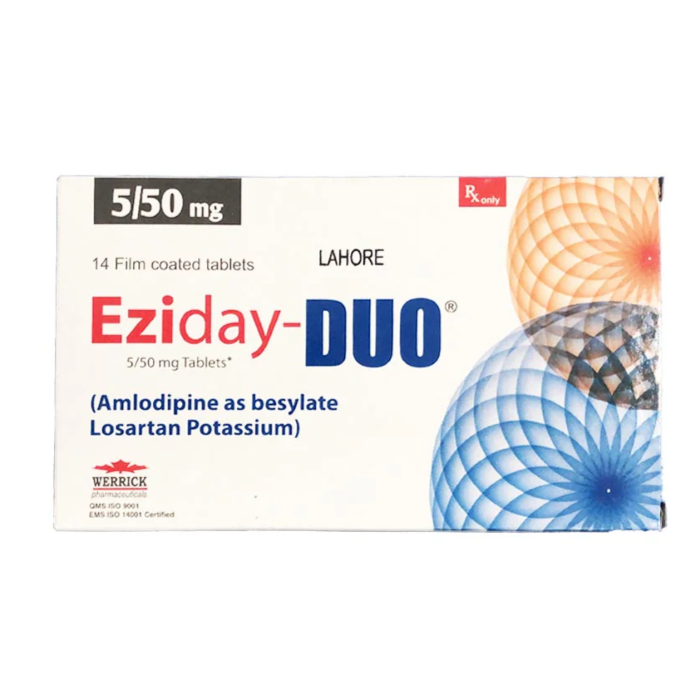 Eziday Duo 5mg 50mg Tablets 14s by Werrick is a combination medication used to treat high blood pressure. It contains two active ingredients, Amlodipine Besylate and Losartan, which work together to lower blood pressure and improve blood flow.