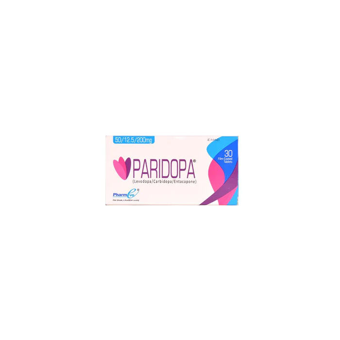 Paridopa 50mg 12.5mg 200mg Tablets by Pharmevo is a medication used to treat symptoms of Parkinson's disease, such as tremors, stiffness, and slowness of movement. This combination medication contains three active ingredients – Carbidopa, Entacapone, and Levodopa – which work together to help improve the communication between the brain and muscles.