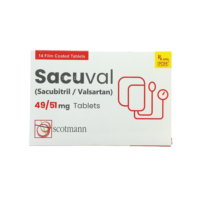 Sacuval 49mg 51mg Tablets by Scotmann is a prescription medication that combines two active ingredients, Sacubitril and Valsartan, to treat certain heart conditions such as heart failure and high blood pressure.