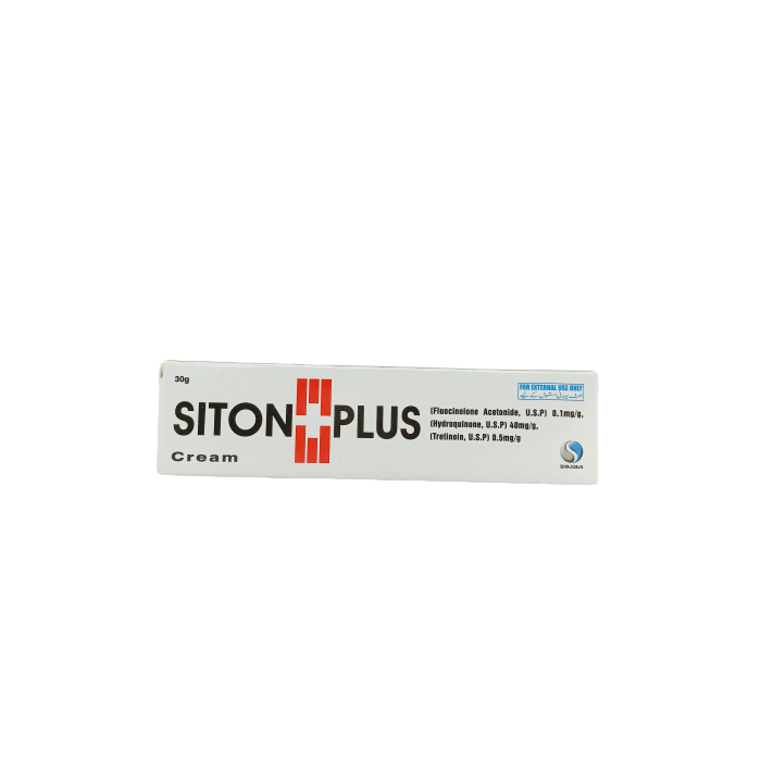 Siton Plus Cream is a skincare product that combines the powerful effects of Flucinolone Acetonide, Hydroquinone, and Tretinoin to effectively treat various skin conditions. This cream is designed to brighten and even out skin tone, reduce hyperpigmentation, and improve overall skin texture.